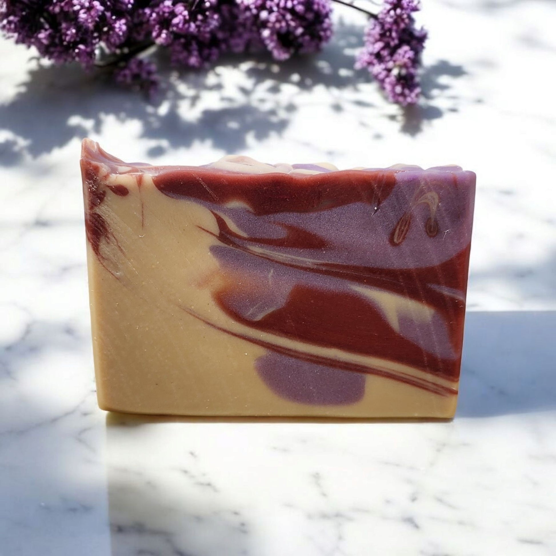 Soap Contains: Elderberry Tea, Castor Oil, Cocoa Butter, Palm Kernel Flakes, Apricot Oil, Lye, Sunflower Oil, Hemp Oil, Fragrance, Sodium Lactate, Mica & Titanium Dioxide.